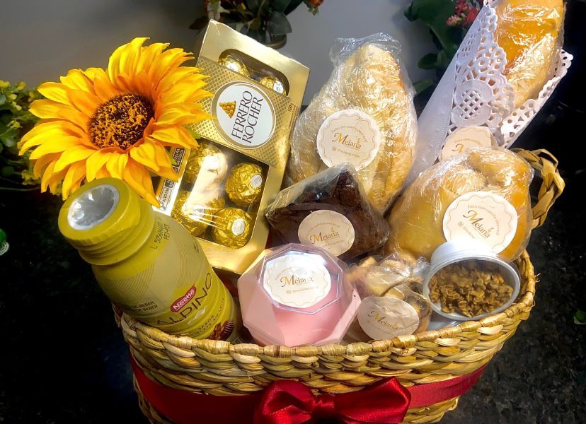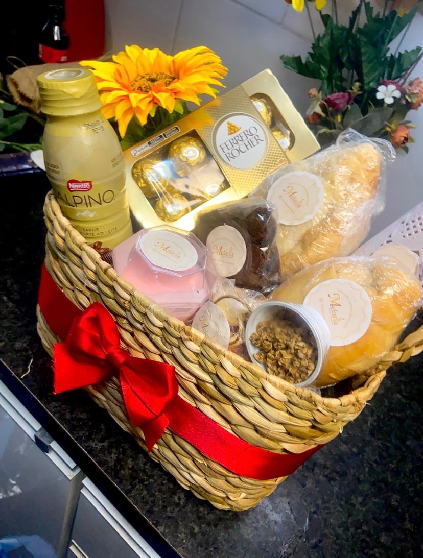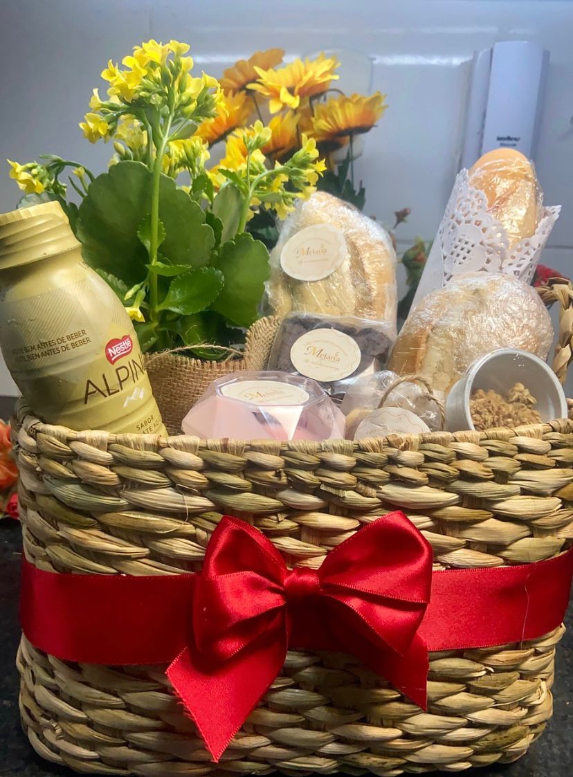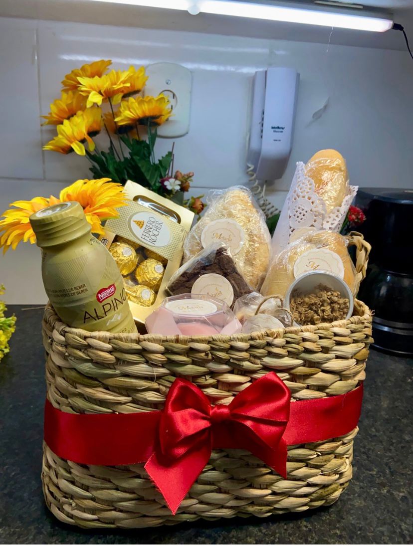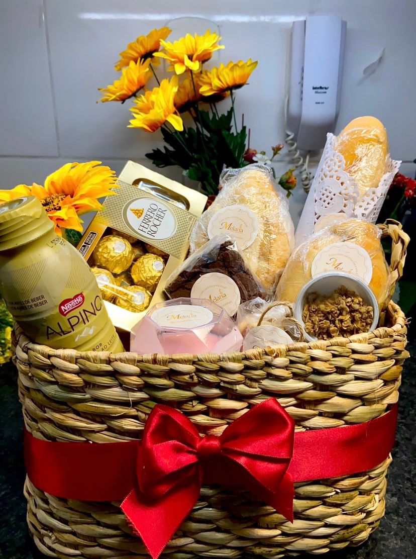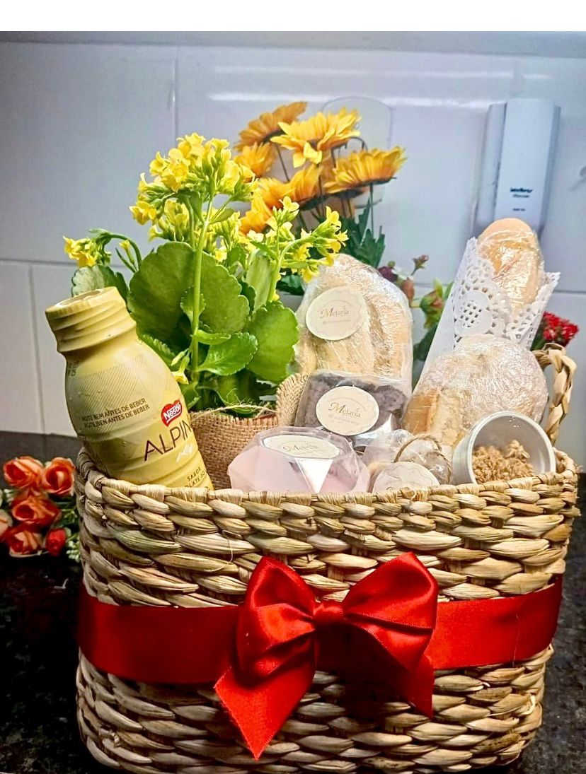 Uma cesta charmosa, com pães fresquinhos, bebida, doces, flor natural e mimos especiais.